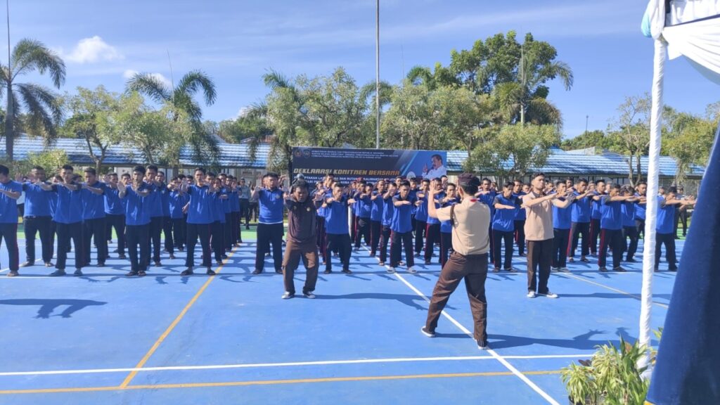 Karang Intan, INFO_PAS — Sebagai bentuk partisipasi aktif dalam menyemarakkan semangat perubahan, Warga Binaan Pemasyarakatan (WBP) Lapas Narkotika Kelas IIA Karang Intan menampilkan yel-yel bertema Zero Narkoba dan HP yang membakar semangat para peserta Apel Deklarasi, Rabu (4/6). Penampilan ini disaksikan langsung oleh Kakanwil Direktorat Jenderal Pemasyarakatan Kalimantan Selatan, Mulyadi, serta seluruh Kepala UPT Pemasyarakatan se-Kalsel.